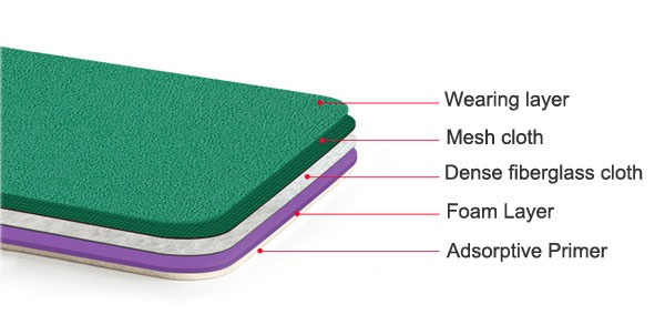 This high resilient, wear resistant surface layer is made up of various resin cushion layers. This PVC is made up of FRP or GFT that gives it high stability and good wear resistance. PVC can be used indoor and outdoor and can be used for different sports. Its high shock absorption properties make its uses in badminton, volleyball and other high impact sports. It can also be used for commercial flooring and educational institutions flooring.